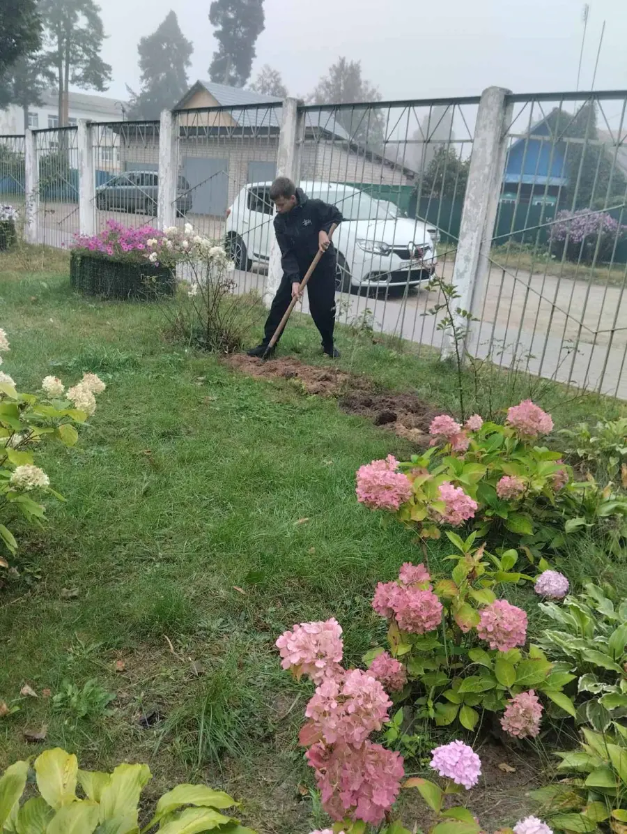 Сегодня в 8 "В" классе прошло мероприятие "Сделаем мир чище". Ребята убирали пожелтевшие листья , остатки увядших цветов с клумбы и занимались перекопкой почвы.